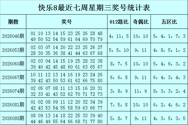 福彩快乐8第2026088期(上周三)开奖回顾:08 09 13 14 18 22 25 33 39 40 44 46 49 55 64 66 68 71 77 80,其中奖号012路比为5:8:7,奇偶比为9:11,五区比为4:3:5:3:5。